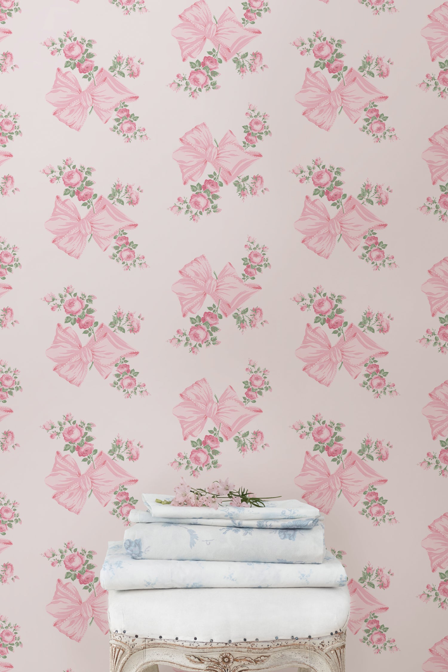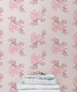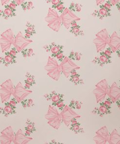 This vintage-inspired design offers both soft femininity and southern charm. Loopy pink bows loosely tie together clusters of pink cabbage roses. Each roll measures 20.5” x 33′.