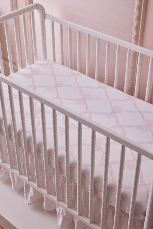 Our little loves’ cribs are extra cute with our new embroidered crib skirt featuring our iconic baby bow pattern.