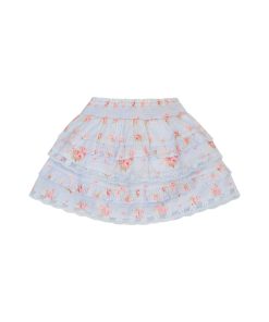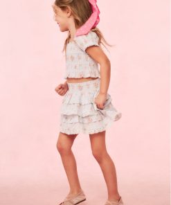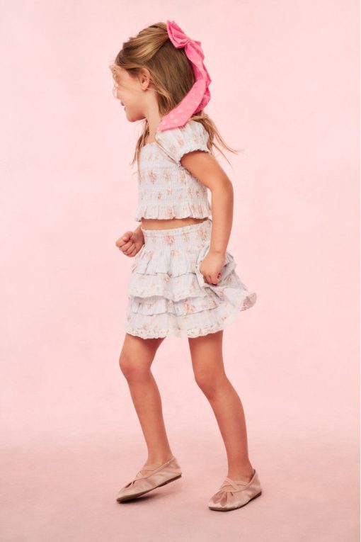 Our beloved Billie Skirt in 100% cotton with our ikat floral print – our original, signature oversized bow. Below a wide smocked waistband, the skirt falls to two shirred tiers with ruffle details.