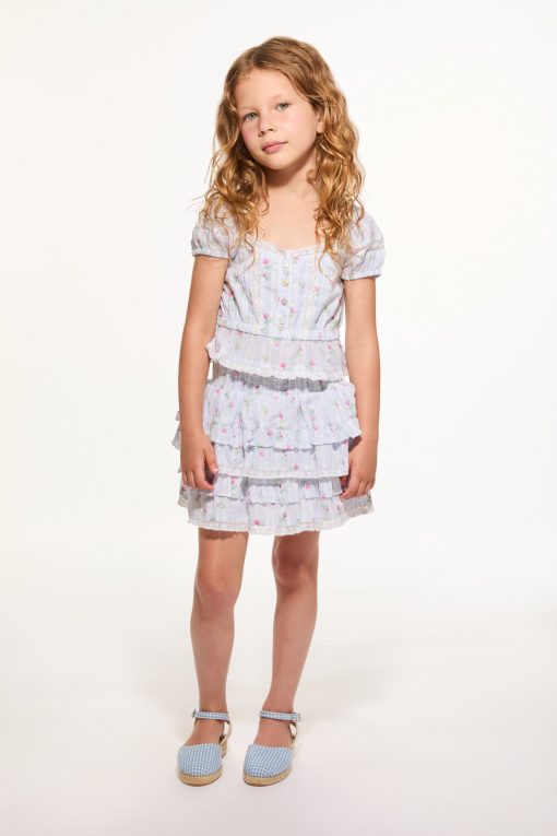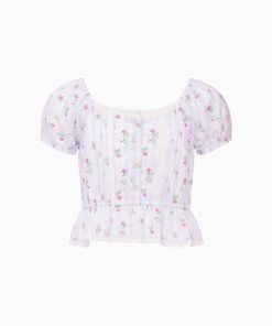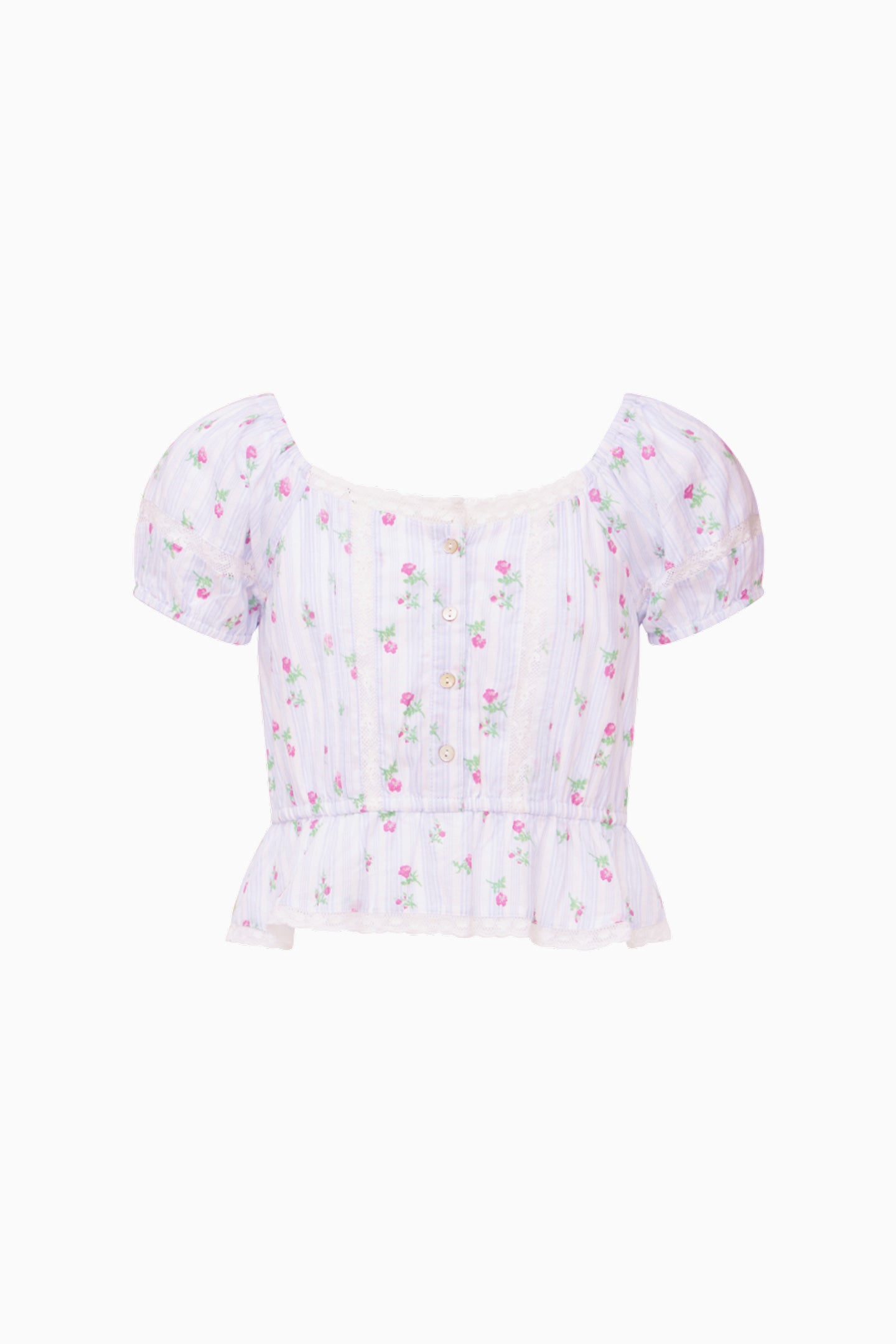 Introducing the Ottie Top. This pretty piece features a dainty floral print all over, short cap sleeves, buttons down center front, and a ruffle-adorned hem.