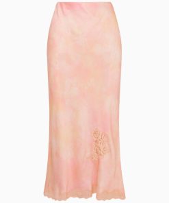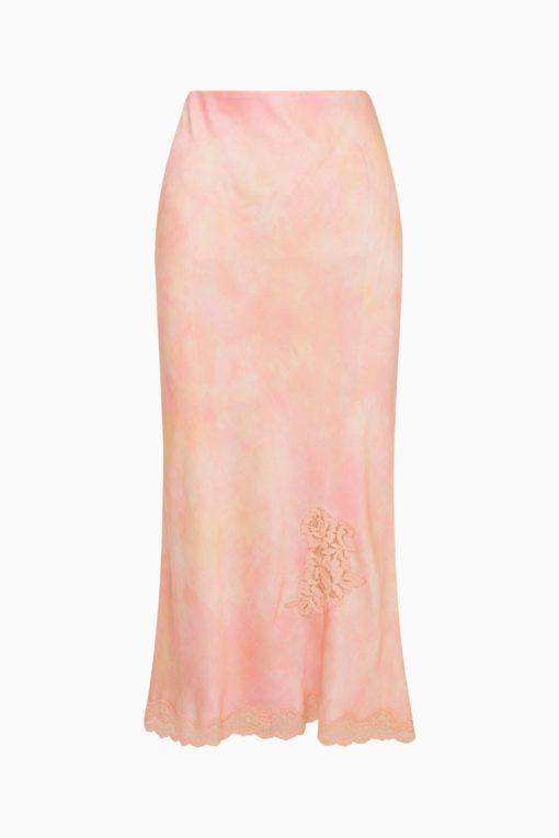 Introducing the Aubrette Skirt. This bias slip skirt arrives in a solid charmeuse silk blend fabric with a hand-dyed-like print all over. Easy to pull on, the feminine midi has vintage-inspired laces at the hem and a sheer flower embroidery patch around the knee area. Pair with the Petrou Top for a full set.
