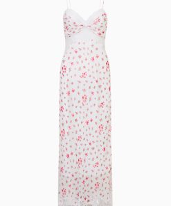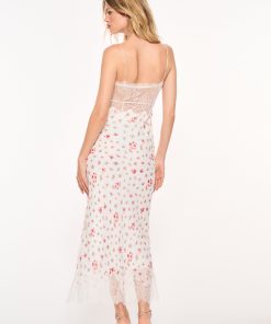 Feeling flirty in the Bristelle Dress. This cami slip dress debuts in a viscose chiffon fabric featuring spirited bouquet prints that have been inverted to an All-American red-and-white colorway. The midi has spaghetti straps and a twist draping detail at the bust that falls to a layer of chantilly lace at the bodice over the draped chiffon. With a bias cut, this dress is slinky and easy-to-wear. The dress is finished with chantilly lace at the hem.