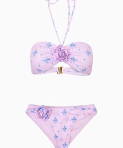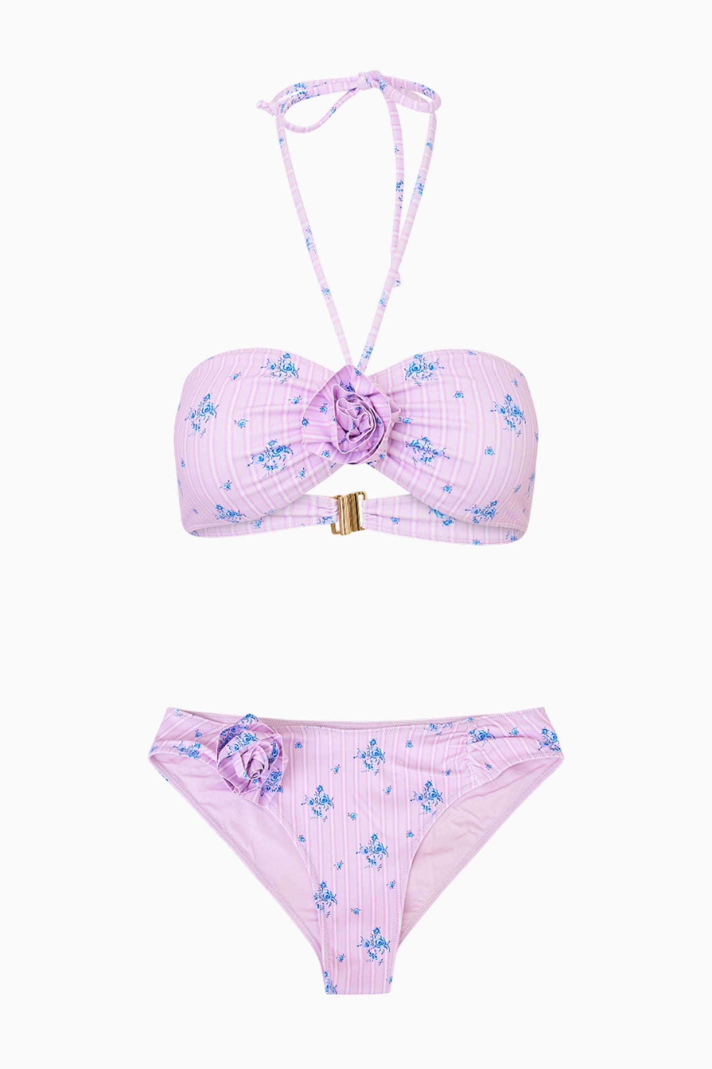 Effortlessly chic in the Candace Bikini. This sophisticated swimsuit stuns with removable rosettes on the center front of the top and at the hip of the bottoms. The top of the suit features a gold hardware hook-and-eye closure on the back and a self tie for around the neckline. The flattering bottoms hug your hips and provide easy and comfortable wear.