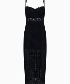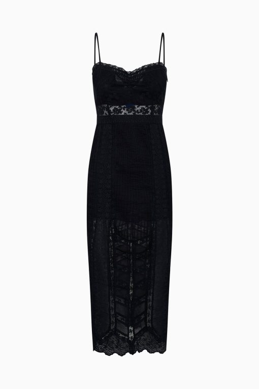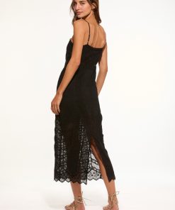 Sophisticated and sexy in the Celadine Dress. This chic midi is designed with a stretchy, ultra-light cotton voile fabric with zig zag wide vintage-inspired laces all over and delicate threaded ribbon trims. With a column shape, the dress begins with thin spaghetti straps that fall to a slim bodice with smocking at the back that descends to a flirty pencil-shaped skirt with a center back slit. A zipper is included.