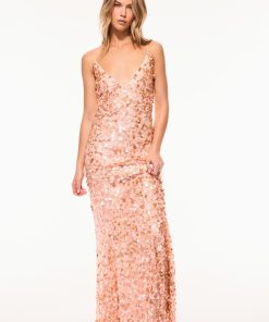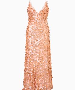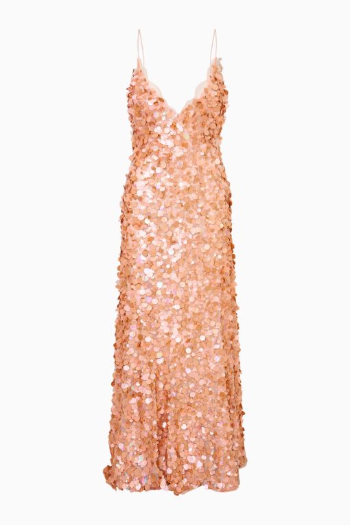 Introducing the Emmalisa Dress. This elevated evening dress stuns with large shimmering payettes all over giving it the ultimate summertime glow. The statement maxi features delicate spaghetti straps, a body-skimming silhouette, a sweeping skirt, and is finished with a zipper for closure.