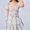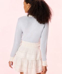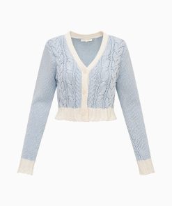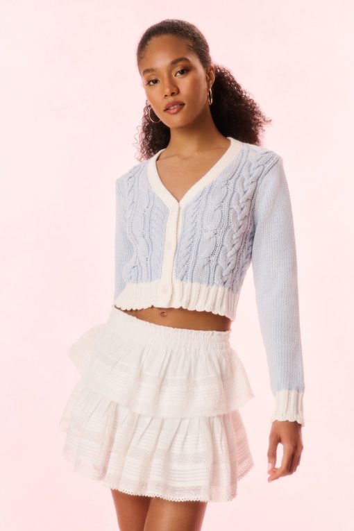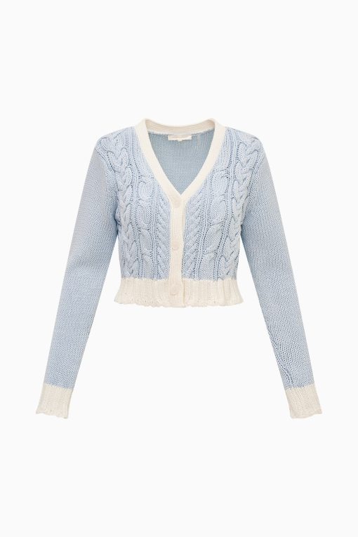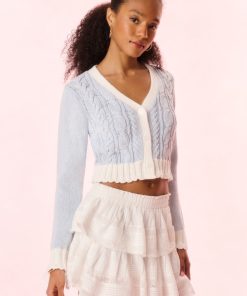 Introducing the Hyacinth Cardigan. This chunky knit features cable details on the front while sleeves are an easy, jersey knit. The layer has contrast trim and a contrast placket with custom bow shell buttons. With a slightly cropped hem, this cardigan has a nice and flattering fit.