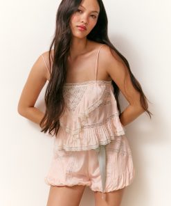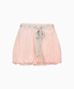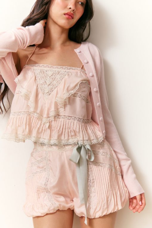 Introducing the Ivania Shorts. These Bohemian-inspired bottoms are designed from a luxe, silk habotai fabric. The bubble bloomer shorts have contrasting blue grosgrain ribbon woven through lace at the waist that can be tied into a bow, delicate laces and pintucking all over, a bubble silhouette, and is finished with a zipper.