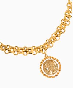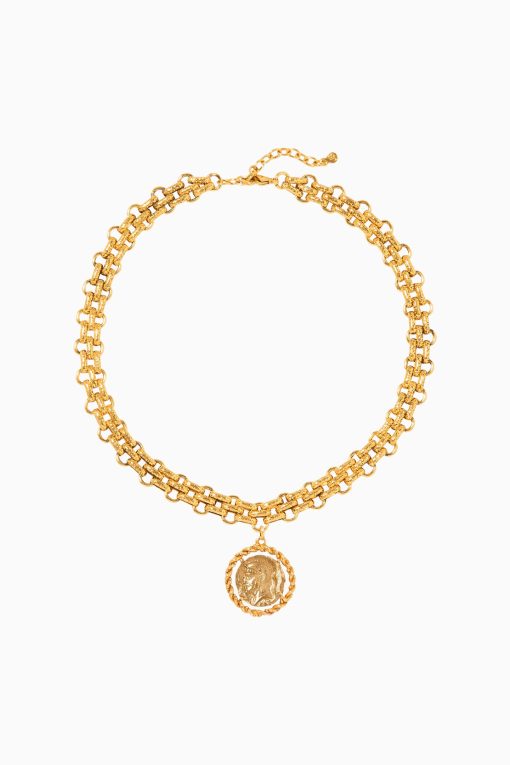 The Augusta necklace from Jennifer Behr is crafted of thick 18K-gold-plated brass centered by a charm with a sculpted relief motif, framed in a twisted circle.