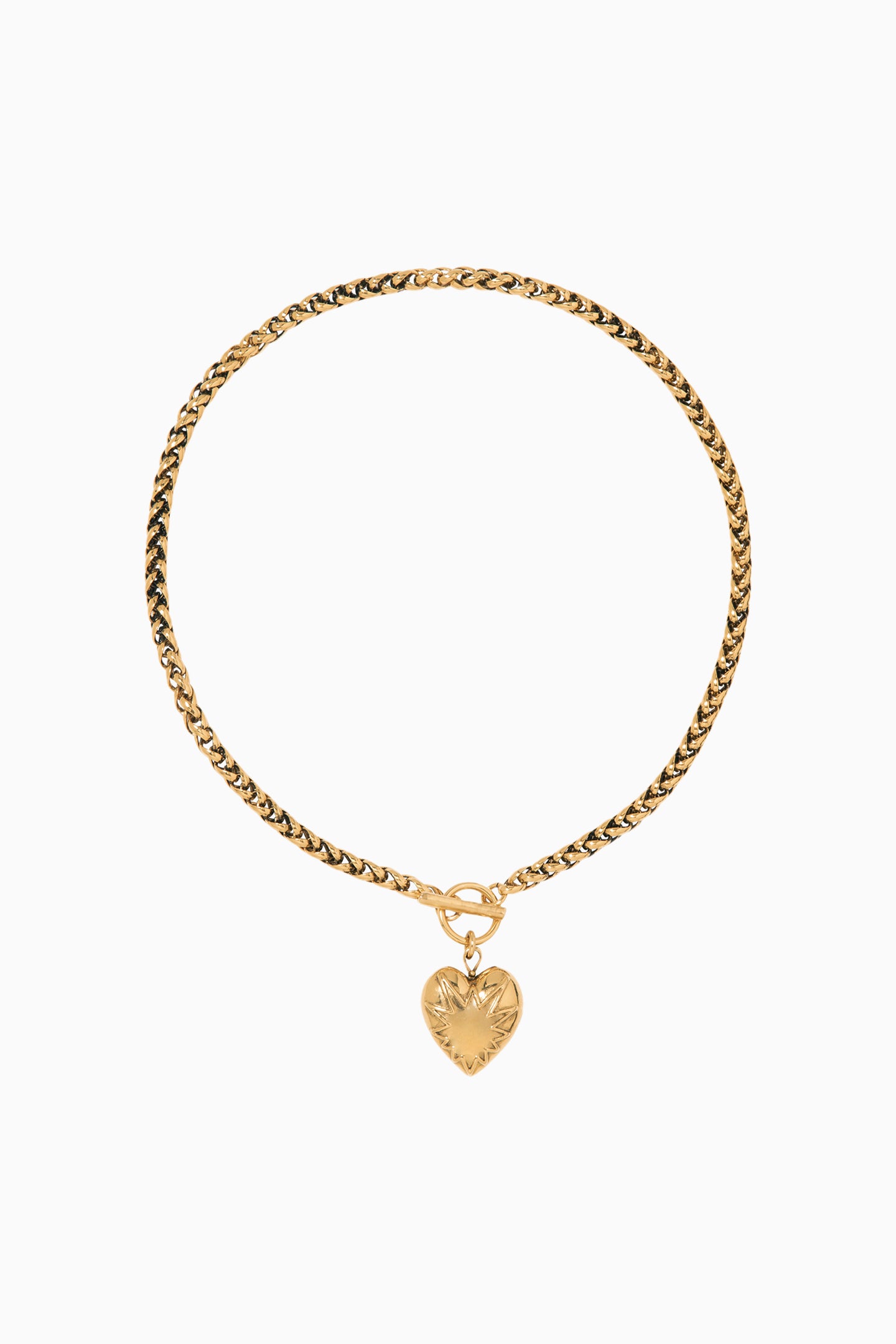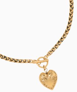 The Jennifer Behr Corazon necklace features a gold-tone wheat chain with a T-bar fastening and a heart shaped pendant.