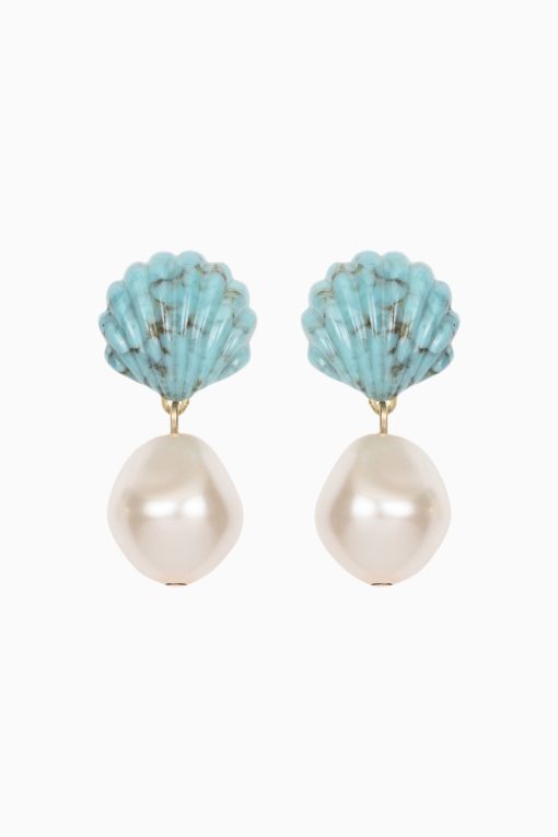 An unexpected finishing touch, the Nori Earrings find semi-precious turquoise formed by hand into scallop shells. Made by hand in New York, the stones are juxtaposed by a baroque-shaped crystal pearl drop. We love turquoise for the natural variations found in each stone, which means no two pairs are entirely alike.