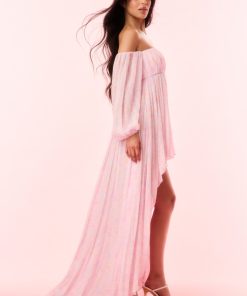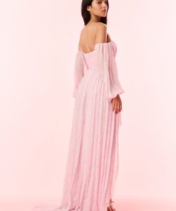 Florals forever in the Kataline Dress. This gorgeous gown arrives with crinkle textured chiffon fabric featuring an optimistic ditsy floral print all over. The high-to-low piece has elasticated, billowy sleeves that can be worn on or off the shoulders, an empire waist with shirring details on the cups for added texture, and structural boning on the interior for added support.