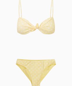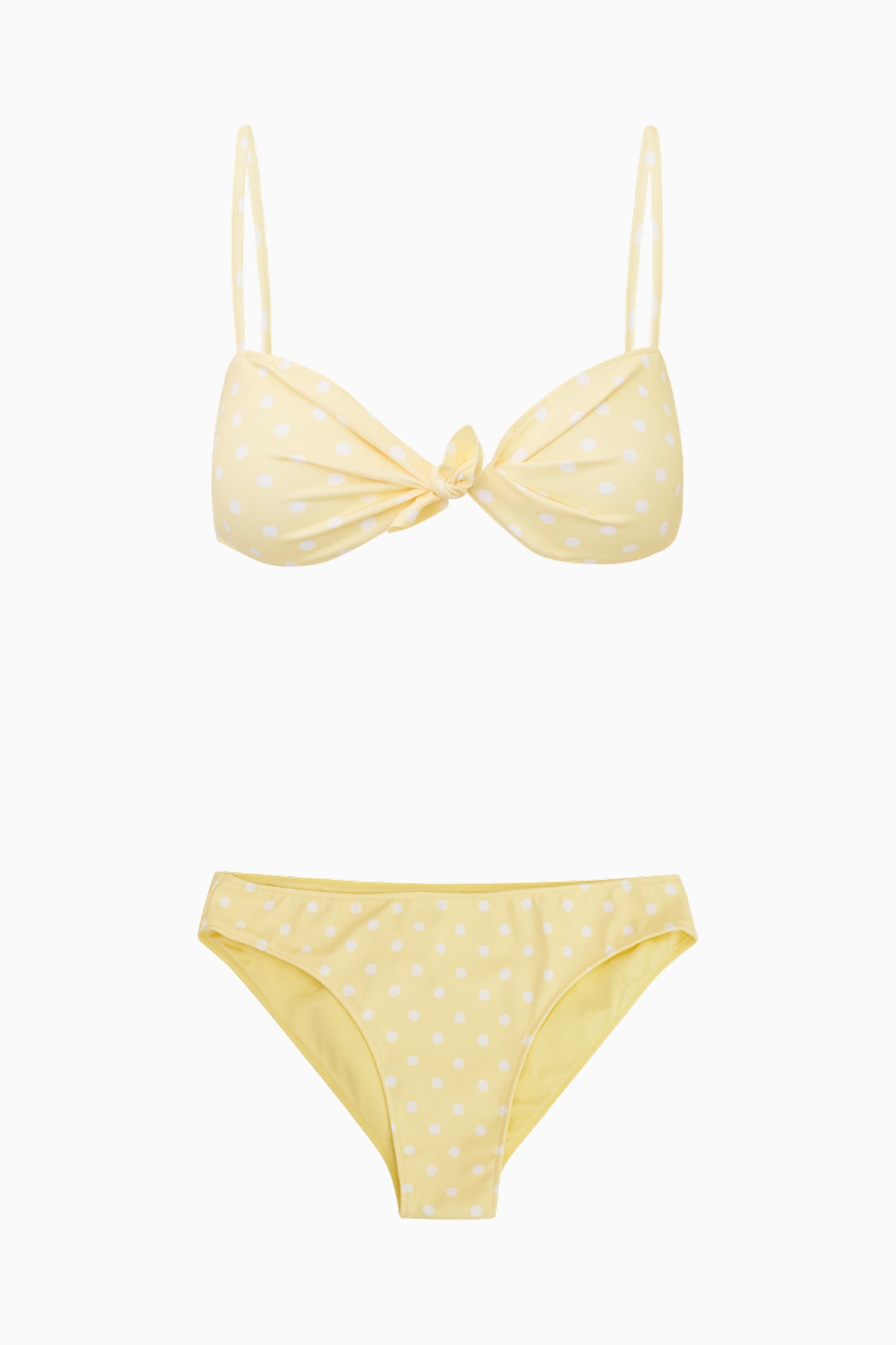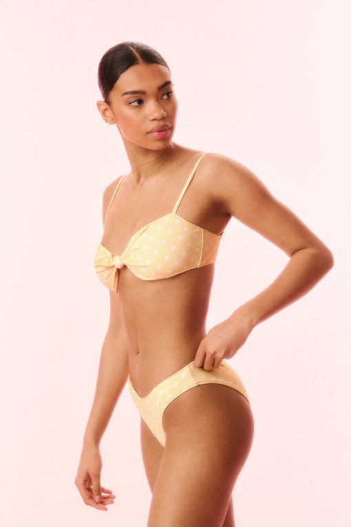 Introducing the Klaudyna Bikini. This sweet swimwear has a tied front for a feminine and flirty look, adjustable spaghetti straps on the top, and low rise bottoms with a little bit of coverage in the back.
