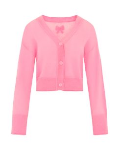 Loving on the Lawrence Cardigan. Designed from 100% cashmere, this knit arrives light and airy featuring charming ribbed details all over with tiny loops, a custom trim with a bow applique at the back of the neck, and our custom LoveShackFancy faux shell buttons etched with a bow down center front giving off a pearlescent effect.