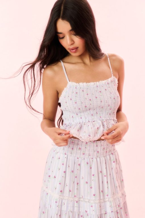 The Marzenia Top returns for the season with a striped cotton voile fabric featuring a ditsy floral print all over. This Victorian-inspired piece features textured stripes, a smocked bodice to the empire waist and a charming flutter peplum adorned with lace trims and delicate tucking. Adjustable spaghetti straps ensure a perfect fit, making it ideal for pairing with skirts or denim for both casual and elegant occasions.