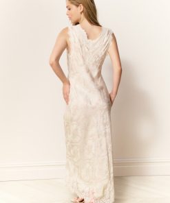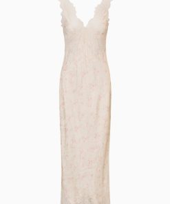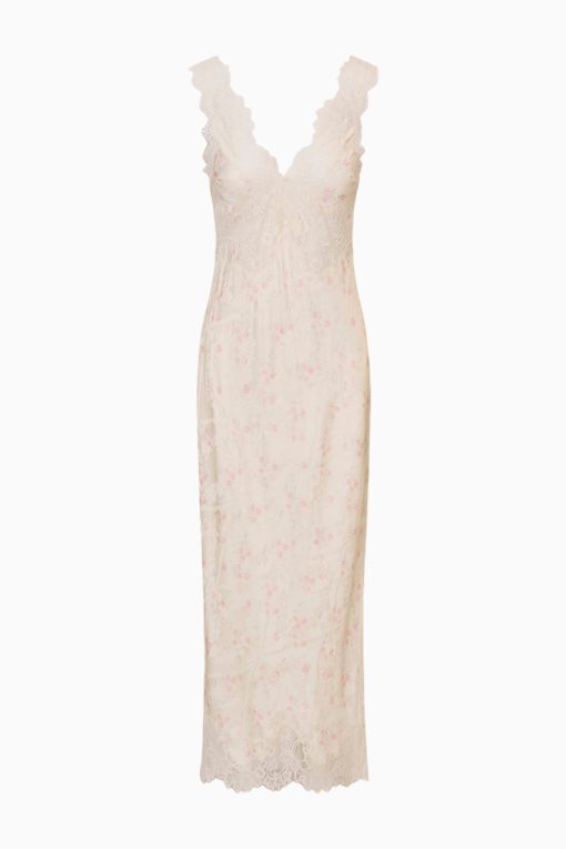 Introducing the Mira Dress. An elevated event dress this bias cut midi dress features a gorgeous jacquard with our floral luna rose bow print. The jacquard is inspired by a vintage demasque wallpaper and french textiles. This piece has scallop lace cutwork all over with careful-placed scalloped lace at the neck and waist giving it a sheer effect and wide straps.