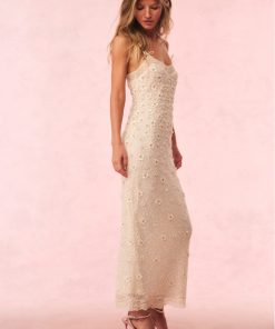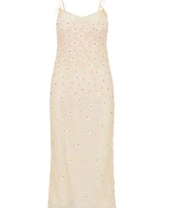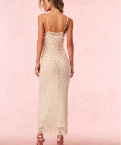 Vacation ready in the Mirrian Dress. This gorgeous evening slip dress stuns with a beautiful blend of hand-embellished details like tiny delicate bows, floral three-dimensional sequins, sequins made out of shell imitations, rhinestones and sprinkles of soft pink sequins all over. The column dress features thin spaghetti straps and a form-fitting bodice into the skirt. This piece is finished with a back slit for walking and includes a zipper.