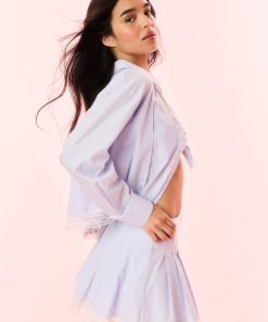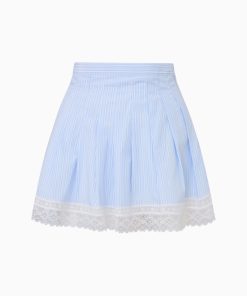Put on the pretty with the Portman Skirt. The mini debuts with a crisp poplin fabric with strips of vintage-inspired laces. This pleated skirt begins with a fixed waist and pellets stitches down the piece that releases at the hip area. The gorgeous mini is finished with a delicate lace arrangement and a structural silhouette with a zipper to make it a fuller looking piece. Pair with the Arvine Top or Delano Top for a full set.
