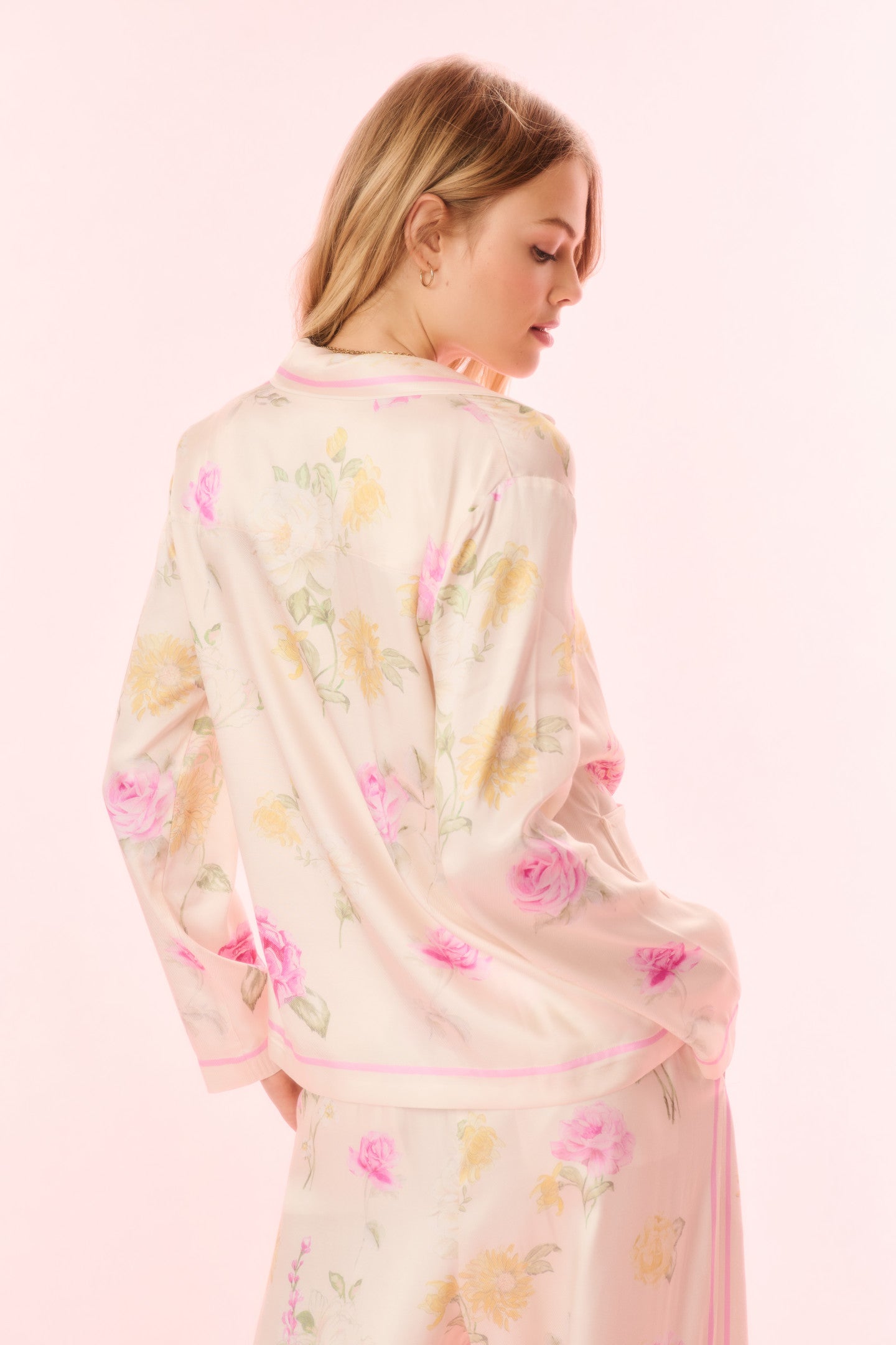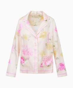 Introducing the Renetta Top. This elevated pajama top features an Italian-inspired print with hand-painted flowers in a romantic arrangement and stripes throughout. The loose top begins with a camp collar, buttons down center front, long sleeves, and pockets at the waist area. Pair with the Helia Pant for a full set.