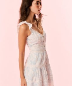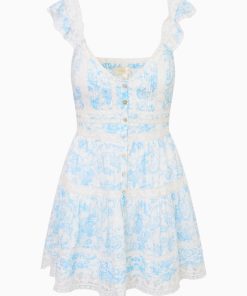 This charming mini debuts with a cotton fabric adorned with vintage-inspired laces and tucking throughout. The piece begins with short flutter sleeves above an open, round neckline that falls to a center front, non-functional placket above a fixed waist yoke. The dress has smocking at the back for an easy and comfortable wear and includes pockets.