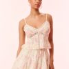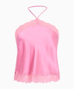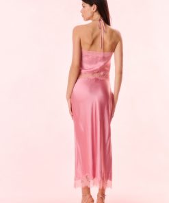 Romance found in the Rivier Top. This elevated top debuts with a silk charmeuse, drapey fabric with delicate chantilly lace trims. The bias cut cami halter features a self tie at the back, lace trimming at the neck and the hem, and includes a side seam zipper. Pair with the Calder Skirt for the full set.