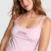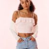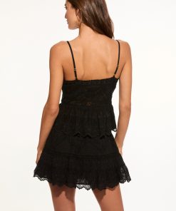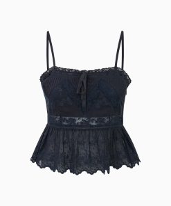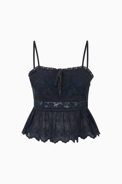 Cute and chic in the Rowina Top. This easy piece debuts with a stretchy, ultra-light cotton voile fabric with zig zag wide vintage-inspired laces and delicate threaded ribbon trims. The peplum cami top is fitted at the waist, has smocking at the back, and is finished with flirty flounce hem.