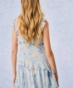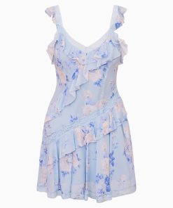 The Serima Dress is back as part of our Fragrance Capsule collection, this time arriving in our best-selling perfume prints.. This gorgeous sun dress is designed with a printed viscose chiffon fabric. The mini begins with tank top straps above a slight v-neckline adorned with tiny ruffles. An asymmetrical ruffle lines the bodice before descending to the airy, pleated skirt.