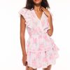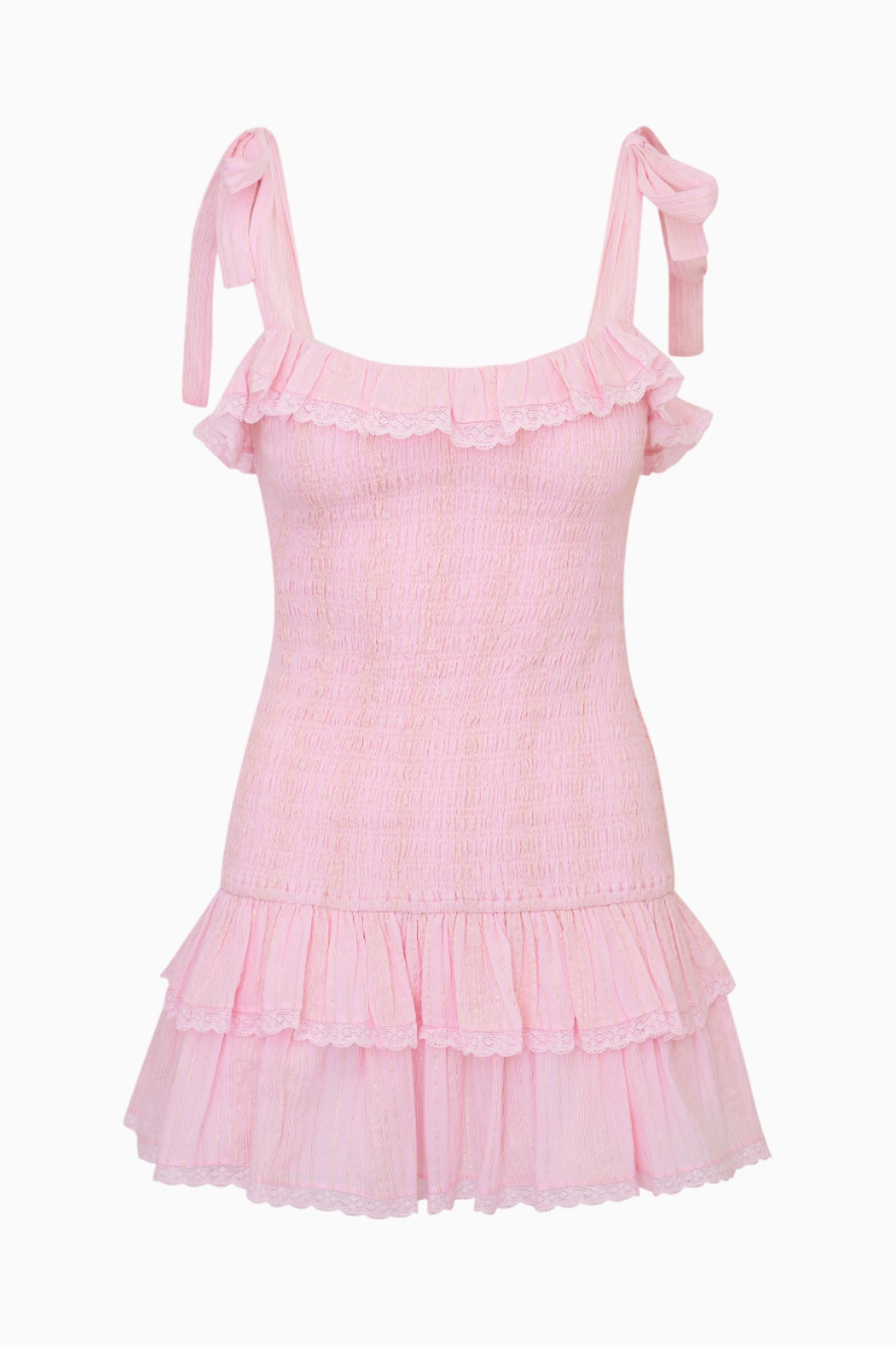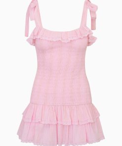 This feminine mini debuts with a cotton fabric adorned with vintage-inspired laces and embroideries. The dress begins with tank straps featuring self tie details, smocking throughout for easy pull on, and ruffle tiers at the skirt.