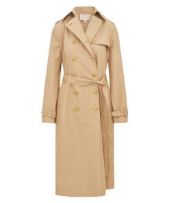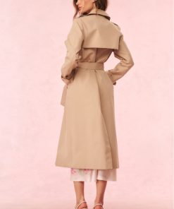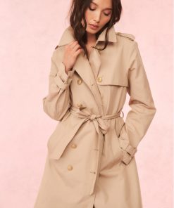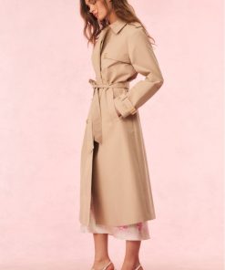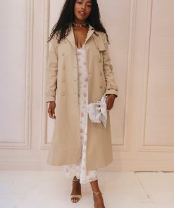 Introducing the Thiel Trench Coat. Our take on a classic, cozy trench coat, this luxe outerwear layer debuts with a midi length and an elevated fabric. Featuring military buttons, the jacket has storm flaps at the chest and back and epaulettes at the shoulder. Giving this piece the LoveShackFancy touch, a giant winding bow applique adorns the hem for a feminine moment. The double-breasted, functional jacket is finished with side seam pockets and a removable belt.