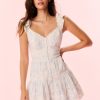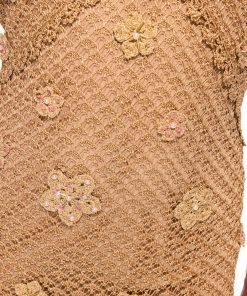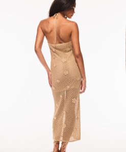 Channeling golden hour in the Vreya Dress. This halter midi makes its debut with an all-over metallic yarn with a nude mesh lining that can be attached with buttons on the inside. The dress features a knit fabric with a full needle rib with hand crocheted flowers adorned with sequins and beads for added shimmer. With self-tie halter straps, the flirty piece has an empire waist with top-applied crochet trim and scallops at the hem and the neckline.